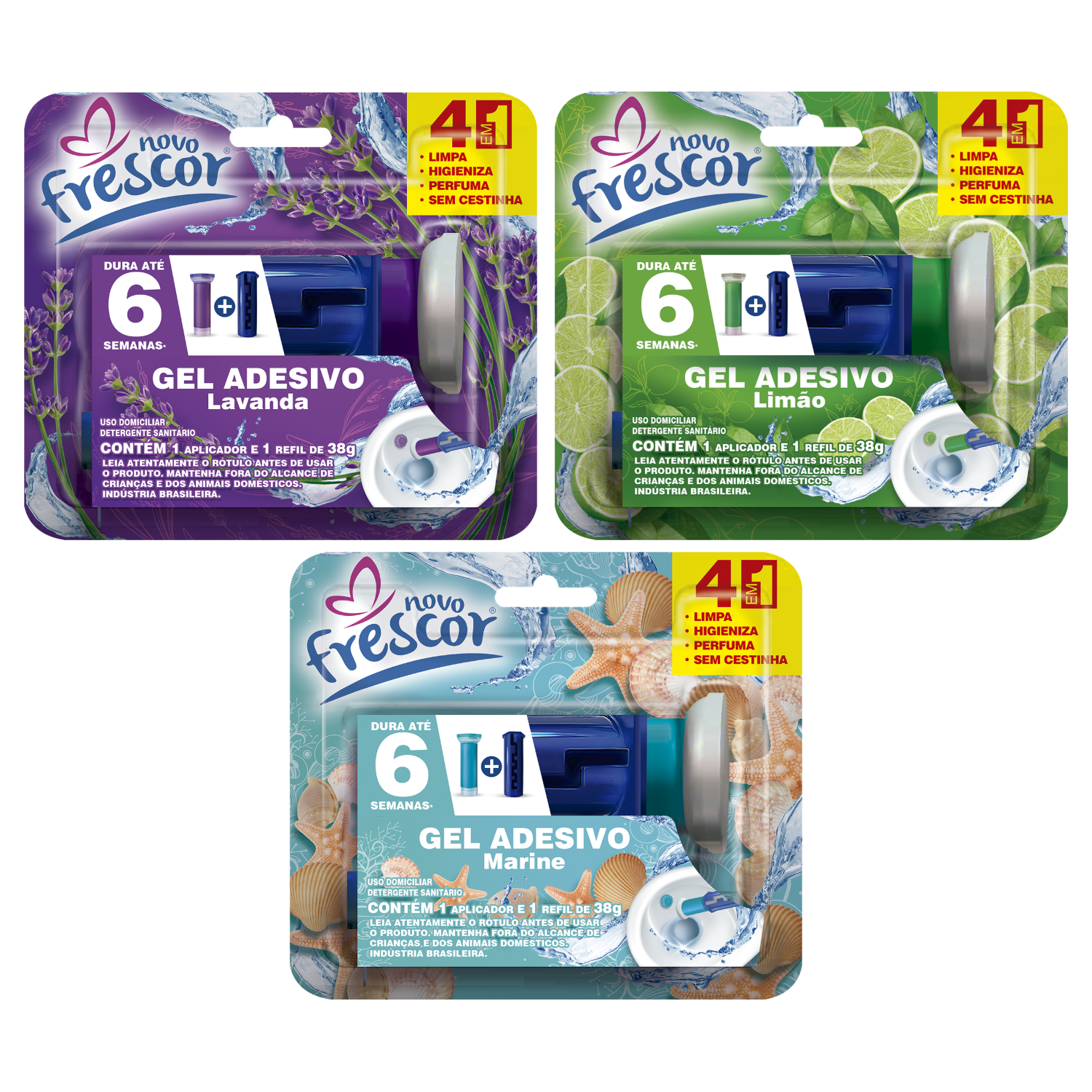 O Gel Adesivo Sanitário da Novo Frescor foi formulado com uma tecnologia, para que cada descarga seja uma experiência revigorante, deixando o vaso sanitário limpo, perfumado e com aquele frescor surpreendente. Além disso, ele é econômico e eficiente. Cada embalagem contém um aplicador com 6 aplicações de pura ação de limpeza, onde cada disco aplicado tem duração de até 150 descargas.