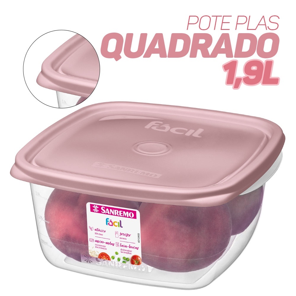 Moderno e arrojado. Vai ao freezer, microondas e lava-loucas. Pegadores laterais que facilitam o manuseio do pote quando aquecido ou em baixa temperatura. Tampa com saliências nas extremidades que facilitam a abertura do produto. Linhas de graduação de volume que facilitam o controle da quantidade de alimento armazenado.